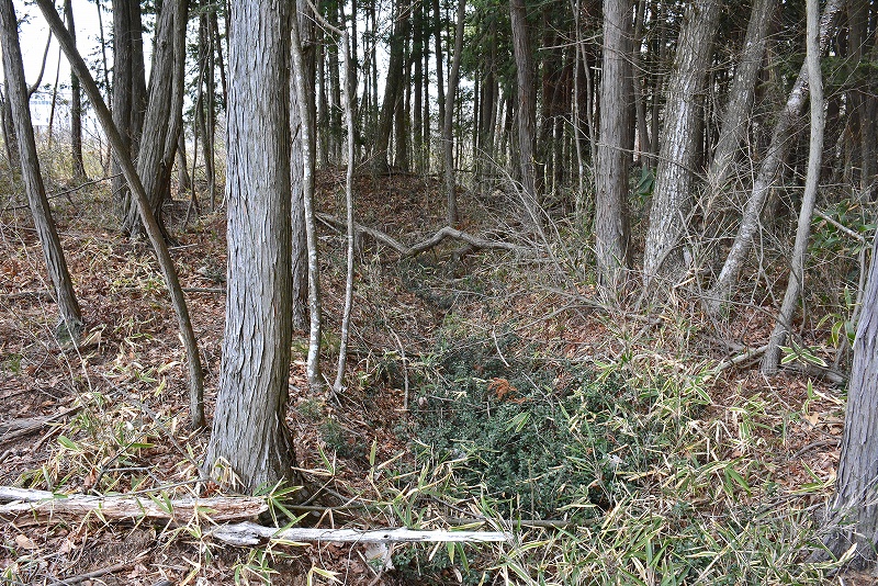 尾根筋は東西に2本存在し、1980年代の城館調査によれば郭、土塁、堀切などの遺構はその2つともに存在しているとされていますが、残念ながら標柱の眼前にある急斜面の尾根筋にとりつけるような個所が無く、西側の尾根筋に至ってはアプローチするような踏み跡さえも見つかりませんでした。