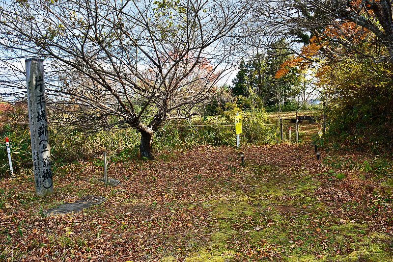 以前発掘調査などが実施された模様で、石臼、陶器、漆器などの遺物が出土し、郭と堀跡も存在していたようですが、現状は資材置き場と水田耕作地となっており、地表から確認できるような遺構は見当たりませんでした。