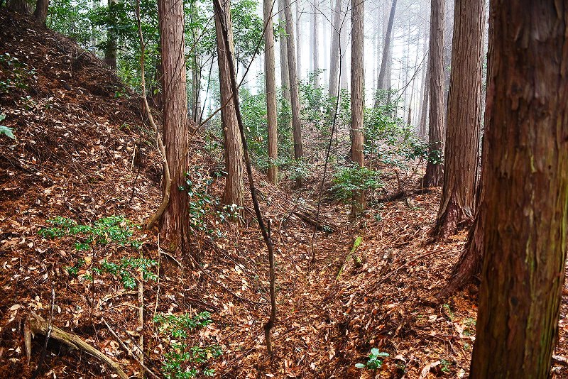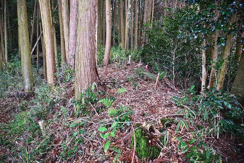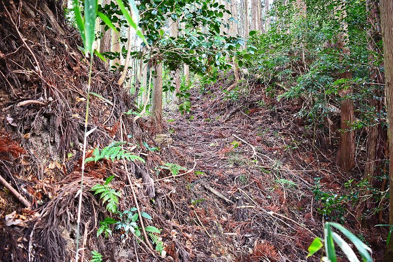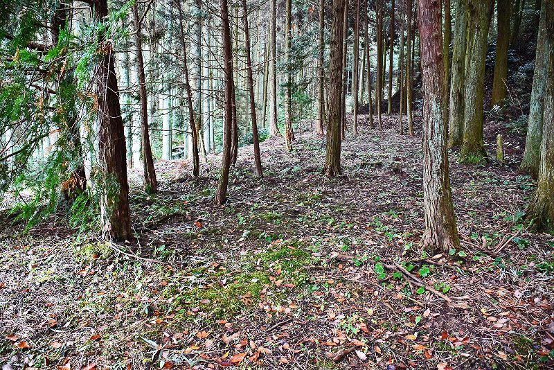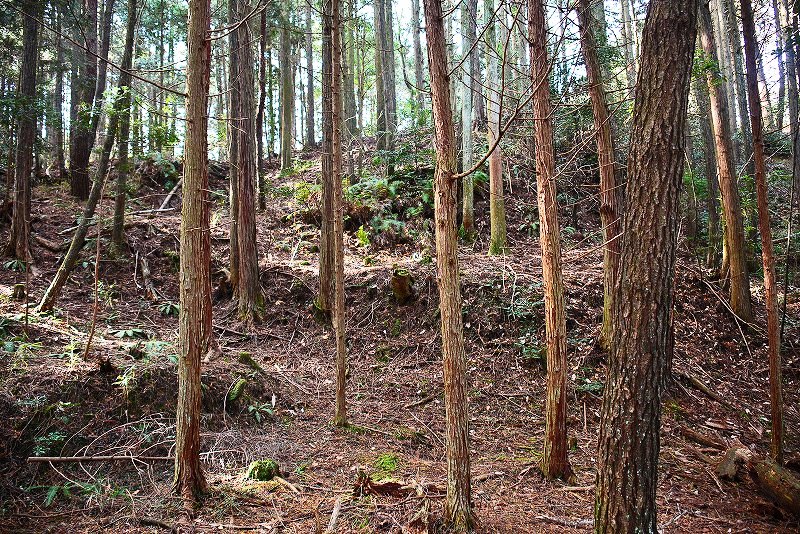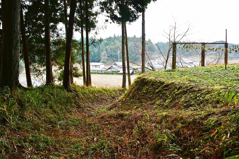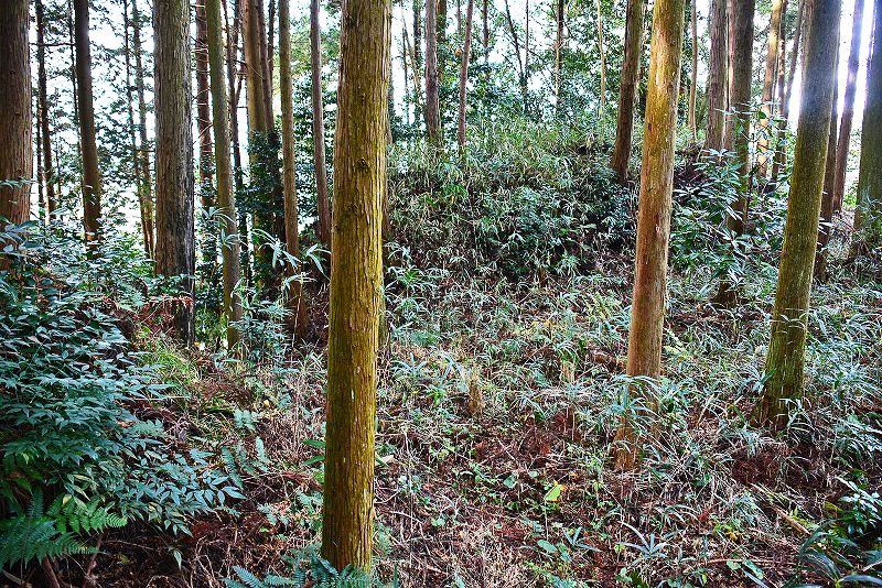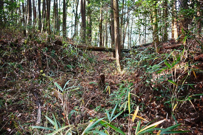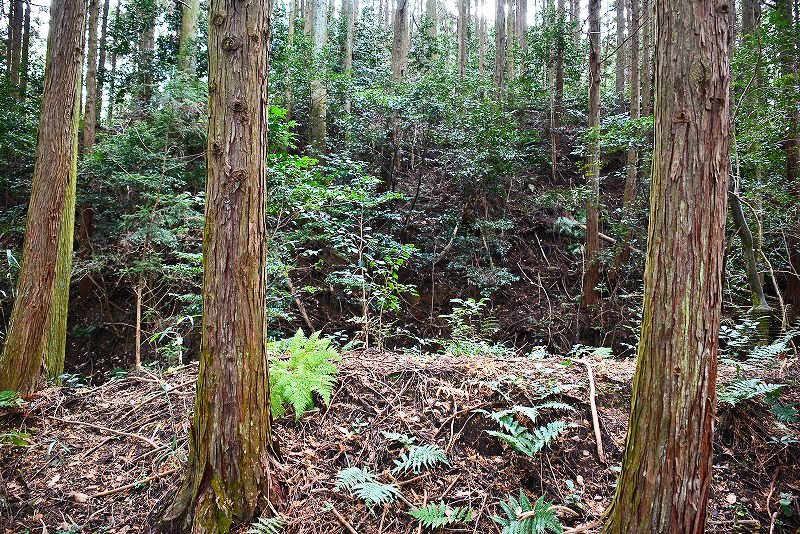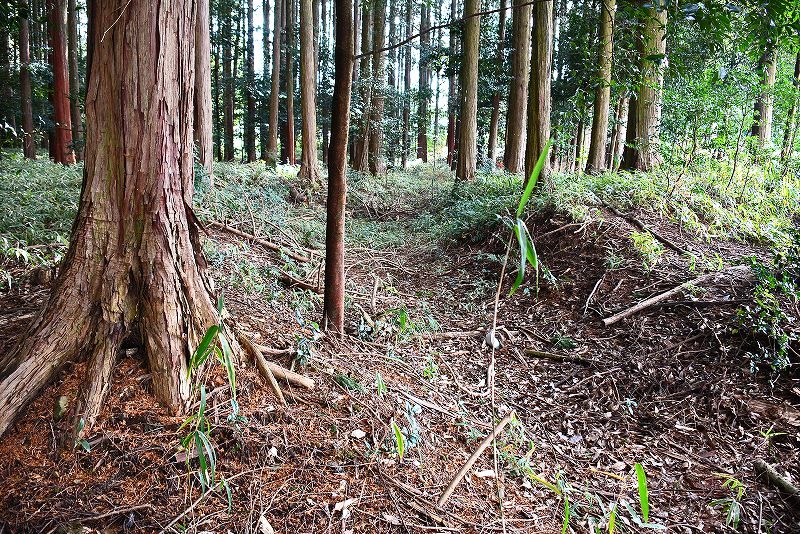油日館の北、県道131号線の東側山林に県道に沿うような形で長さ約100mで東側に土塁状の盛り上がりを伴った幅3mほどの溝状の地形がありました。