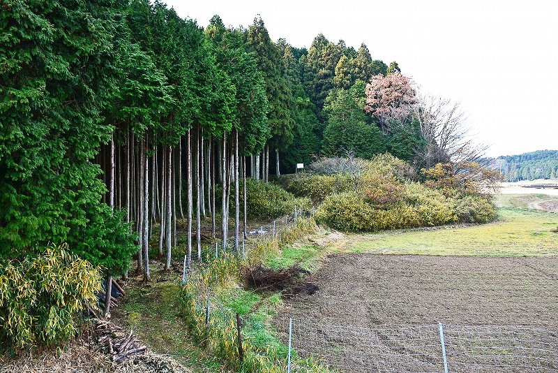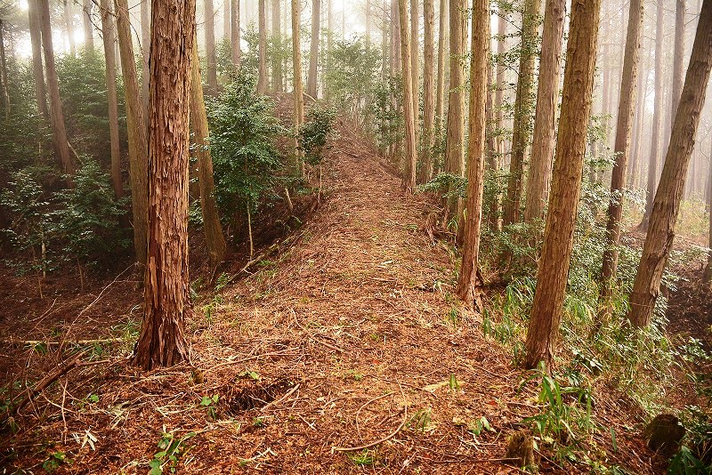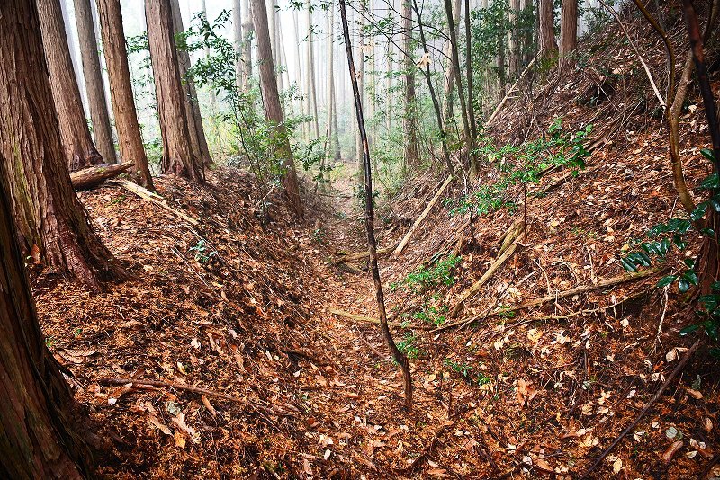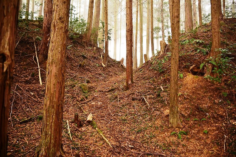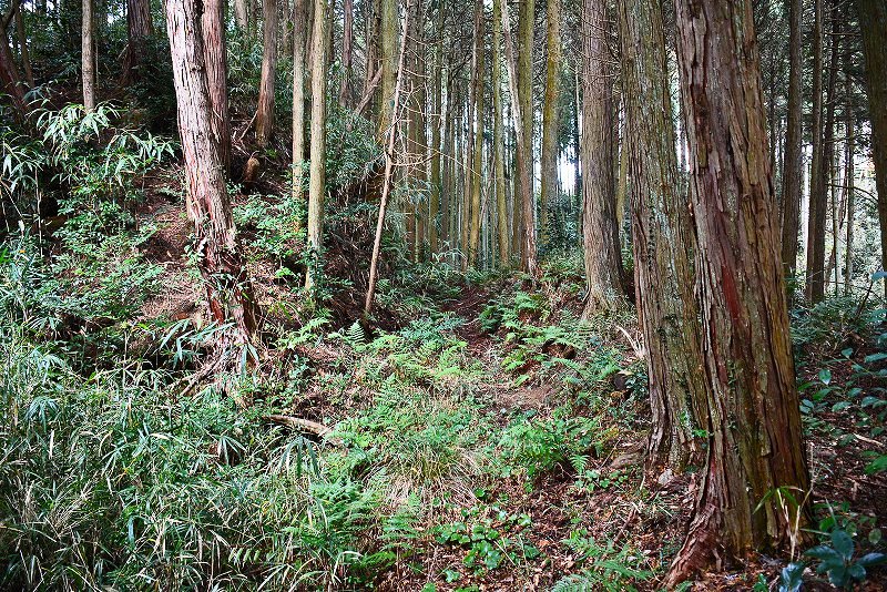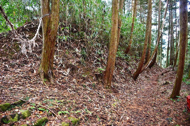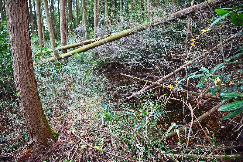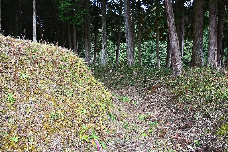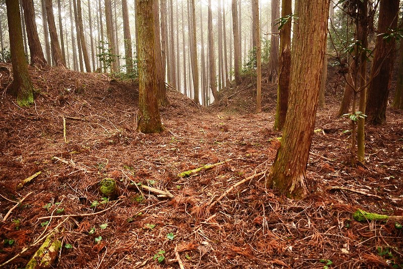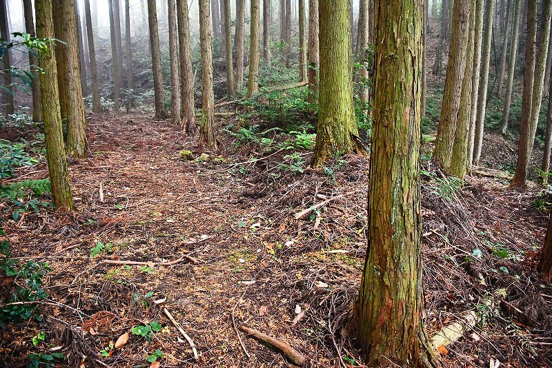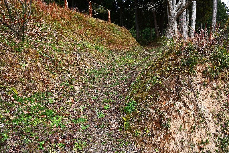 油日館の北、県道131号線の東側山林に県道に沿うような形で長さ約100mで東側に土塁状の盛り上がりを伴った幅3mほどの溝状の地形がありました。