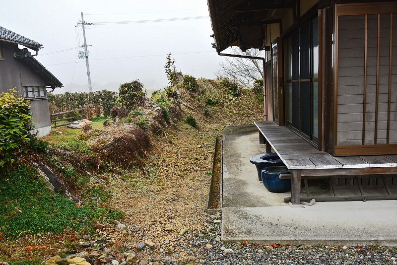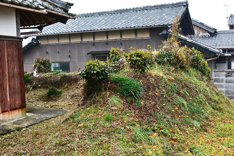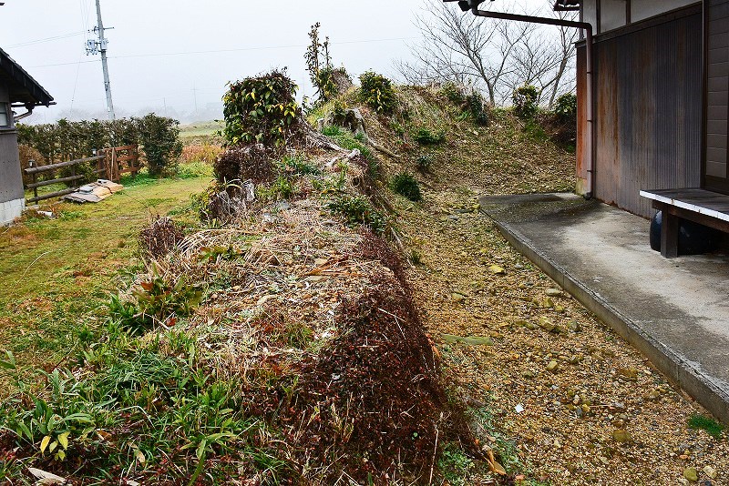竜泉寺境内の西側に長さ20mほどの土塁の一部が残存し、土塁の北端部は東へとのびていた痕跡を示しています。
