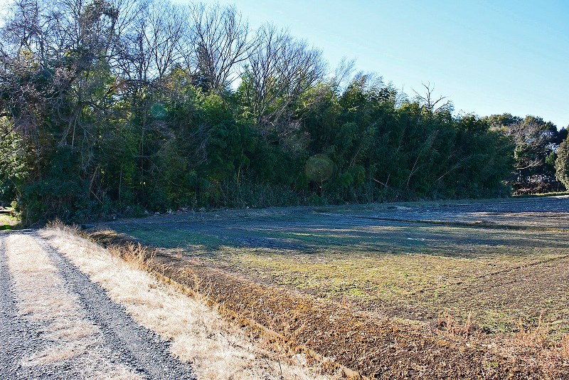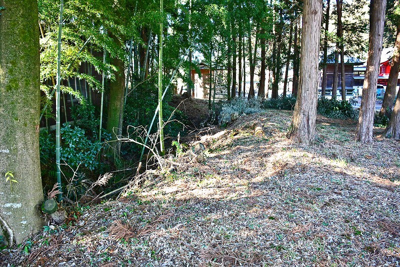 また、(1)の土塁の個所から参道を北へ50mほどすすむと車両通行止めとなった水路沿いの小道があり、これを道なりに100mほど東進すると進行方向にやはりL字型の土塁(4)が現れます。