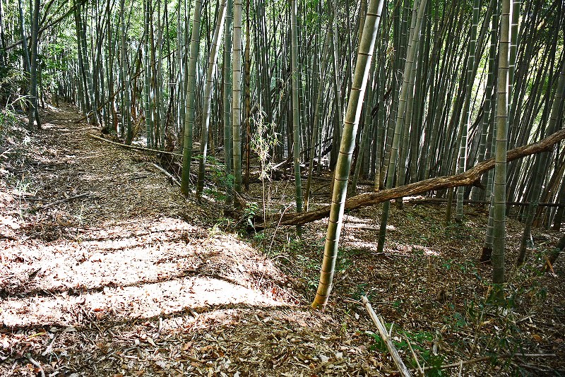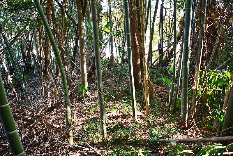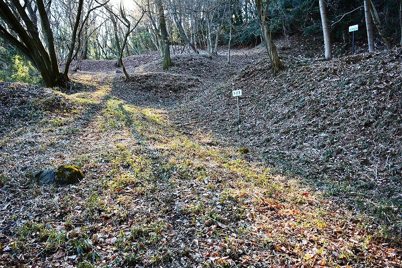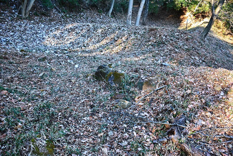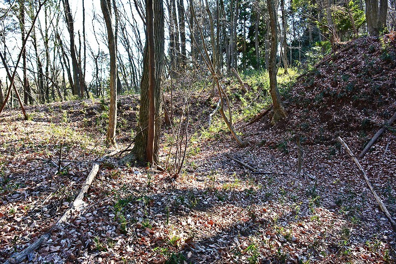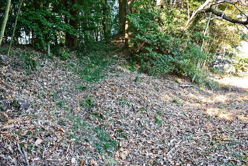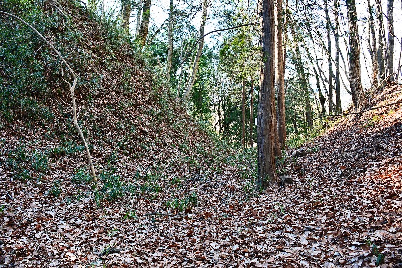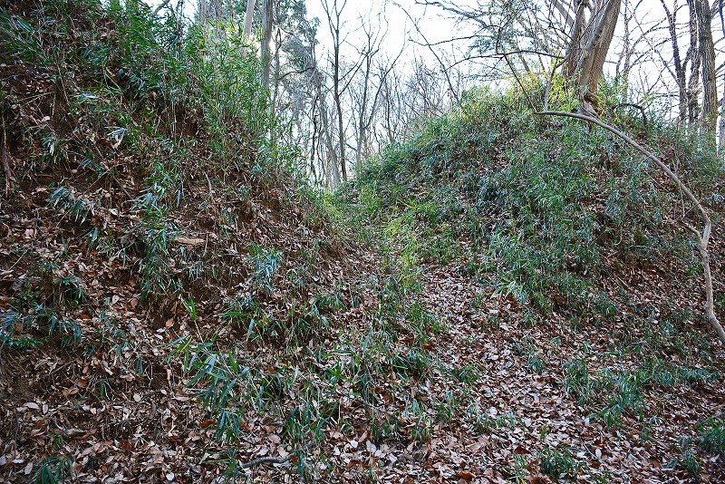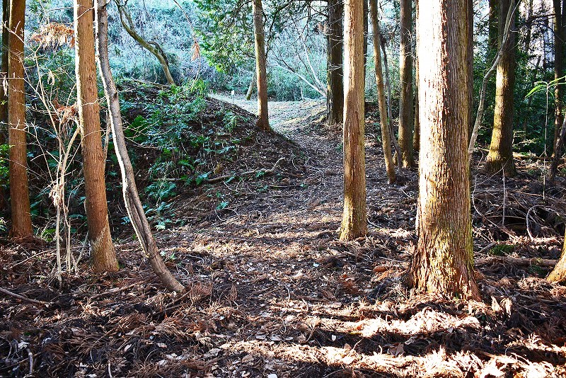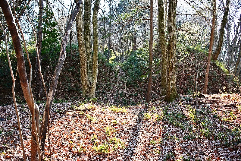 谷筋の登り道は途中で右(北)へと分岐して、そのまま北郭の堀切から続く竪堀を通り山上の遺構群へと誘われます。