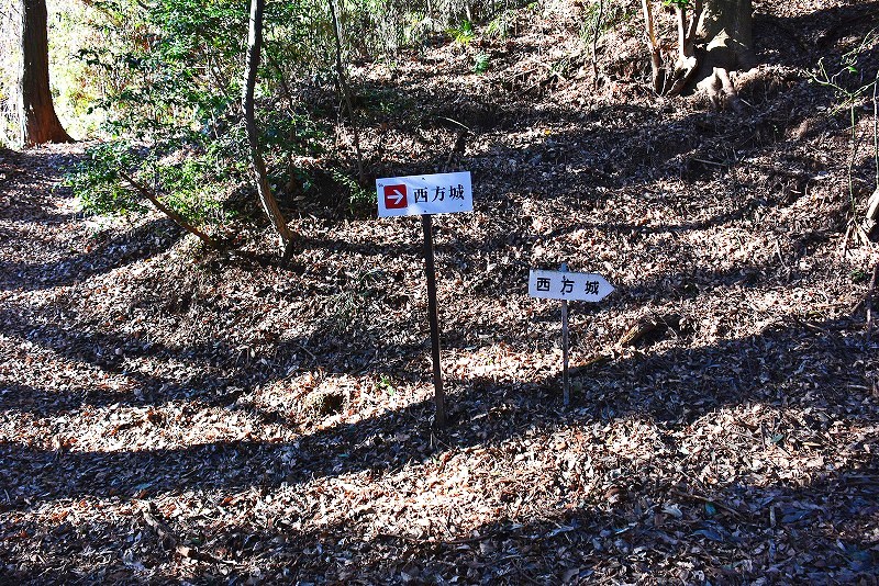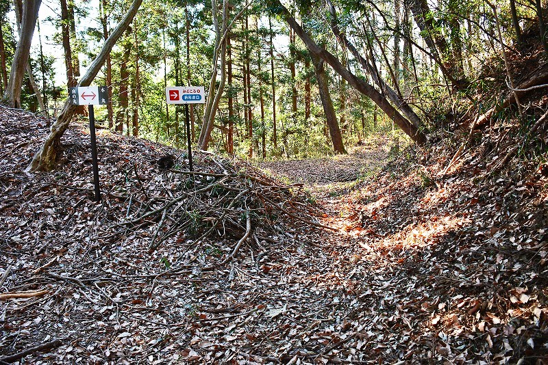 ここで分岐の案内標識とは異なり、そのまま斜面を登る道をとれば水の手とも考えられる山腹の平坦地(郭)へと続いています。