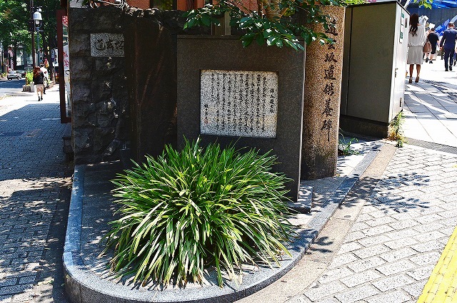道玄坂交番前の交差点手前の少し手前、歩の道左側に設置されている道玄坂の由来碑などを見学。