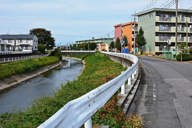 水路を挟んだ西側の方は概ね宅地化され一部畑が残り東には曲折した細道がある