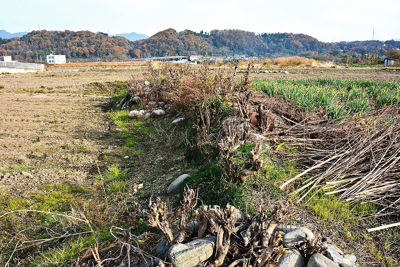 この一帯は畑地中に大きな石が混じる土質(たぶん吾妻川あるいは利根川の氾濫などに起因した川原石)なのだが、石塁であるかどうかは別として延長にして約25mほどの長さにわたり1m未満ではあるが明確な段差が残されている。