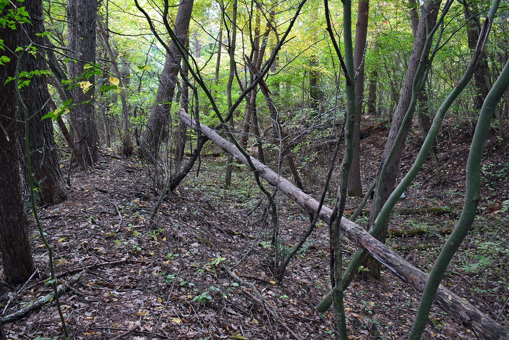 意を決して灌木の枝やクモの巣を避けながら徐々に斜面を登ってゆくと、やがて堀底道のような地形が現れますので、これに沿って息を切らしながら登れば主郭部へ到達します。