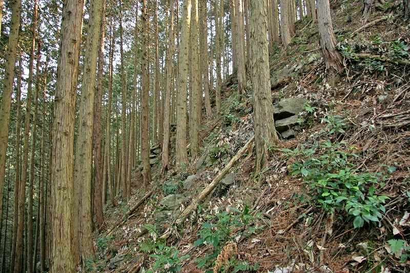 尾根筋の東側には人工的に削平された形跡のある平場が所在。