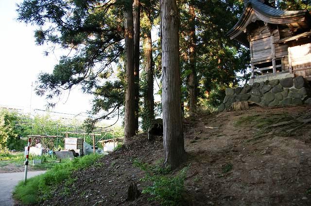 遺構に関連しそうな地形は、西側の空堀跡(現在は畑)と東、北の二方に残る高さ4mほどの切岸状の崖線。