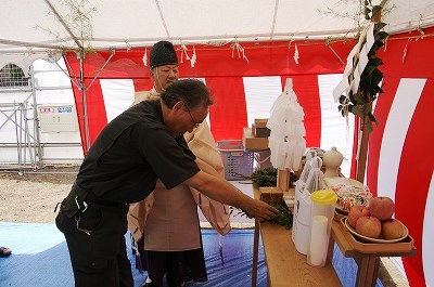 紅白の陣幕の張られた仮設テントのなか、式次第は祝詞、鍬入れ、玉串奉納のみ、神主以下8名による極めて簡略な儀式でありました。