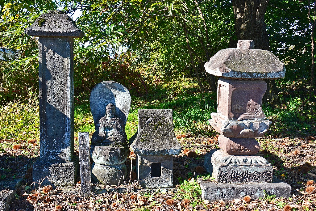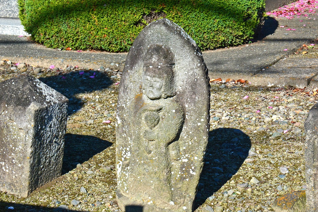 中央やや左側の立像は江戸時代初期の念仏供養塔で、画像左側の石造物は「笠塔婆」のように思われます。