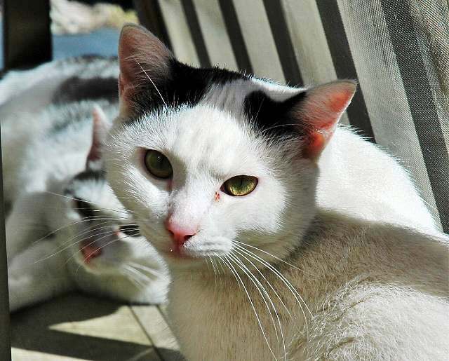 しかし母ネコの「ポミ」(推定体重3K)のベランダの狭い日向ぼっこエリアに、子どもの「いちご」(推定体重5K)が入ろうとしたとたんにポミの低い唸り声の威嚇とともに、ネコパンチがイチゴの顔面に炸裂。