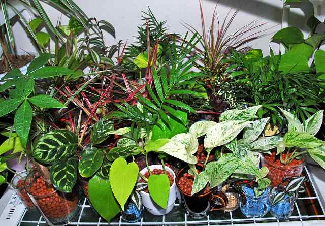 当然種類・品種により異なり、ポトス、ドラセナ類、シャムオリズルランは少なめに、クロトン、パキラはやや少なめに、ピレア、オリズルラン、イレシネ、セブリナはやや多目に、テーブルヤシはいい加減に...全体としてカラテア・マコヤナとペペロミア以外は「葉水」はこまめに朝方に欠かさず、全体として室温15度を下回らないように温度管理を徹底。