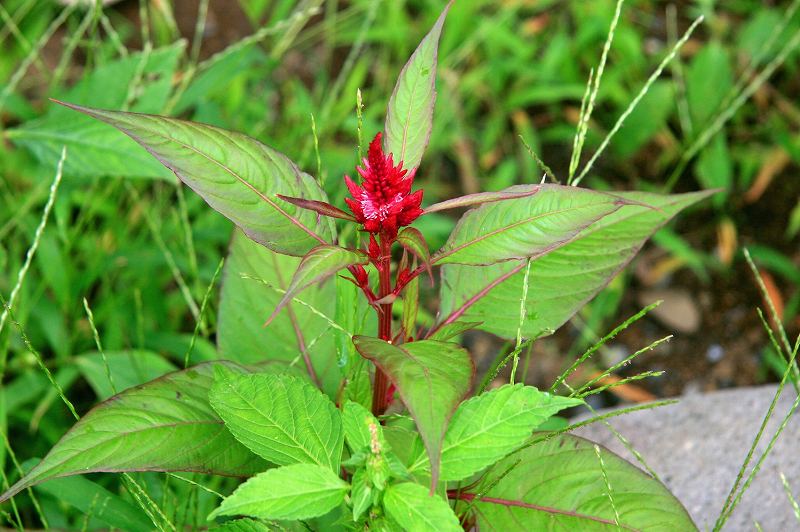 玄関脇のエノコログサの群生の中に何故かケイトウが一本。