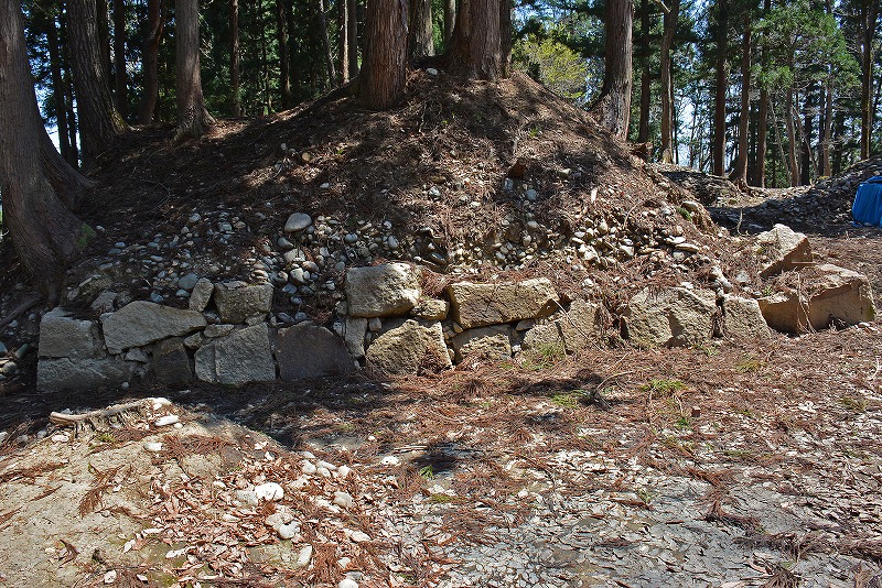 数年にわたる主郭部の発掘作業により残存する土塁には石積が大量に包含されていることが判明したところである。
