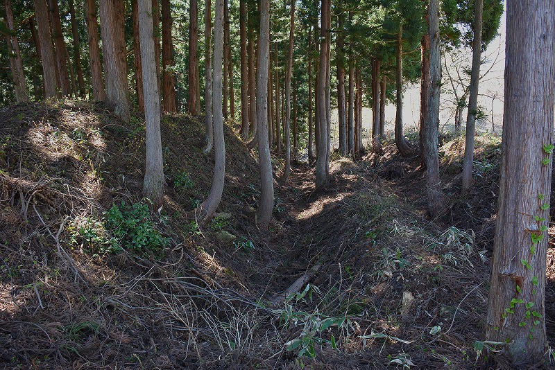 二重方形館としての遺構が杉林のなかにひっそりと残存している。