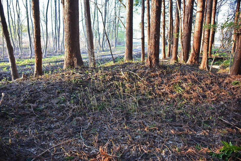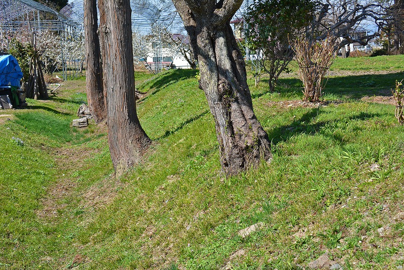 しかし該当地を歩いてみた限りではすでにその形跡は消失しており、僅かに土塁東側に付属していたと見られる堀跡状の窪みが確認されたのみであった。