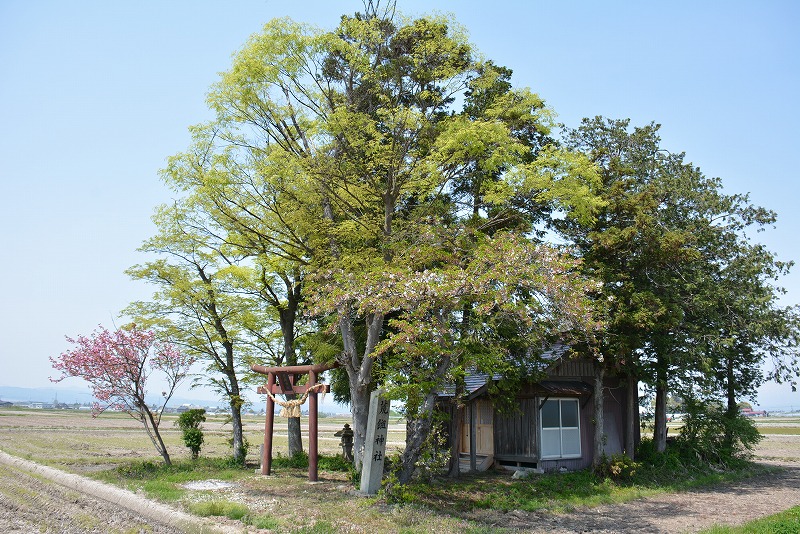 水田の中の微高地となっている神社境内が目印。