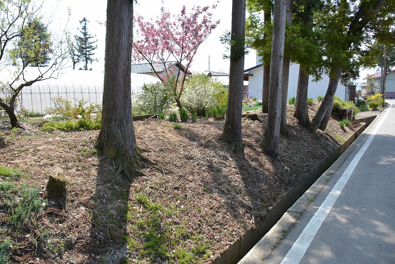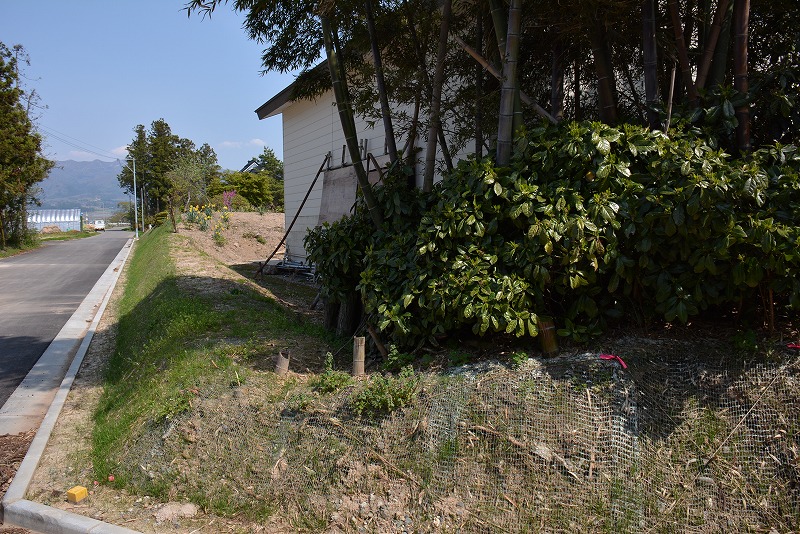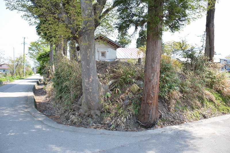 土塁にもみえる盛り上がりが道路際に残る。