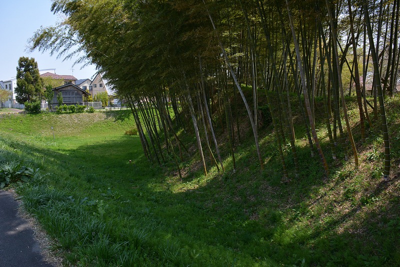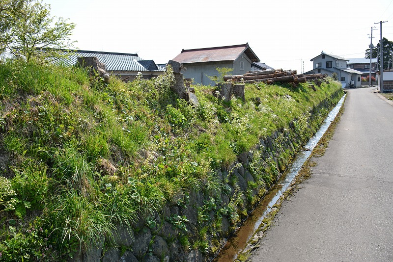 西側の水路沿いを中心に延長50メートル以上の屋敷を取り巻く明瞭な土塁の一部が遺されていた。