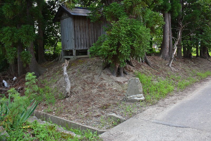 神社境内が目印で境内の南西側に土塁状の地面の高まりと北西側に堀跡と思しき窪地などが認められるが、城館遺構との関わりについては推測の域を出ないものなのかもしれない。