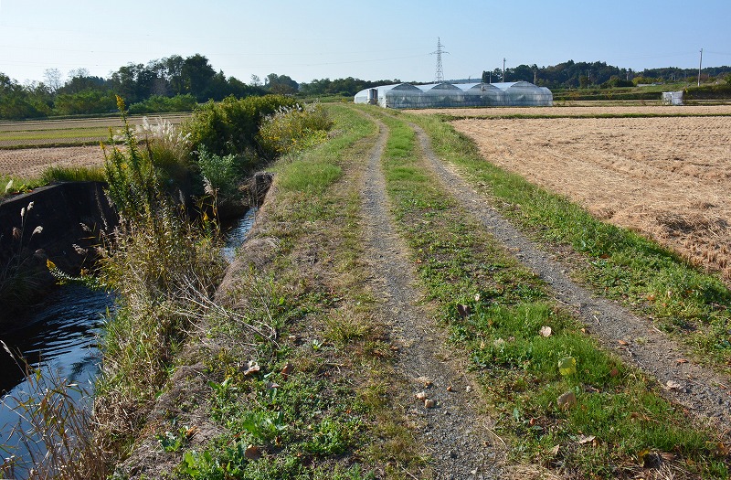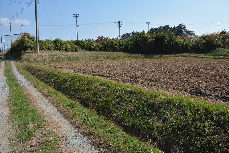 くわえて西側に接して流れている用水路の流路そのものも、県道47号線の北側では丘陵麓を小刻みに蛇行しながら南東に流れていることを考慮に入れると、現在のその形状から想定するにおそらく流路変更されていることが窺われさらにいっそうその面影をたどることは難しく感じた。
