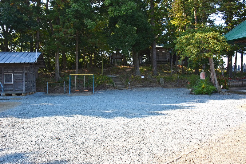 しかし、社殿西側には内側での高さ2メートルを超える土塁が全周しているとともに、東西約30メートル、南北約20メートルほどの楕円形の郭自体もほどよく削平されていた。