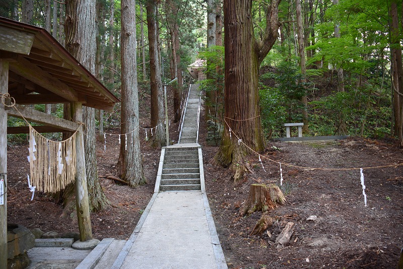 社殿奥は緩やかな鞍部を形成しより標高のある西側の丘陵に連なっているが、その先は踏み跡もなく鬱蒼とした雑木林が続いていた。