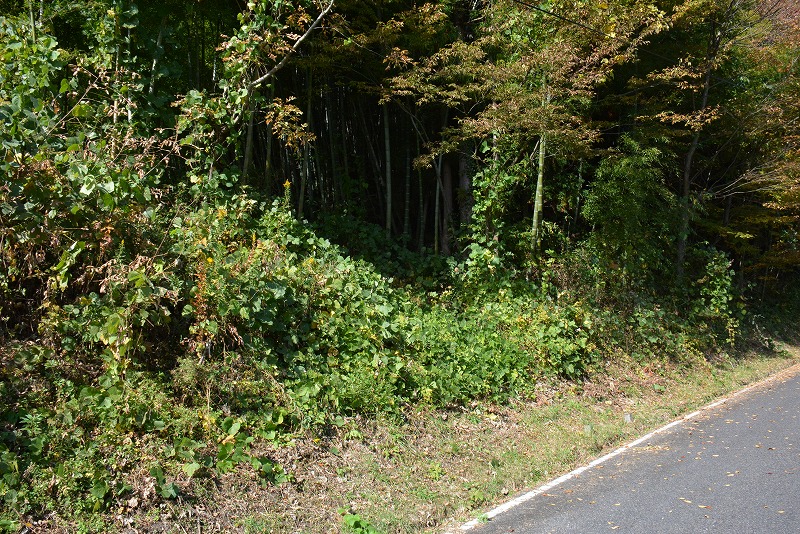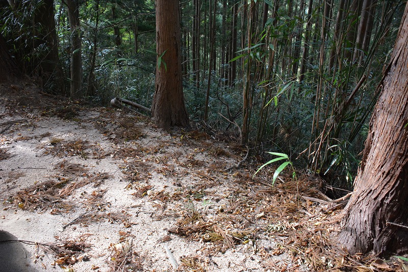 南東端の尾根筋、北西側斜面を観察した限りでは、全体として傾斜がきついことに加えて孟宗竹の密生と雑草の繁茂がすさまじく殆ど取り付く島がないという印象であった。