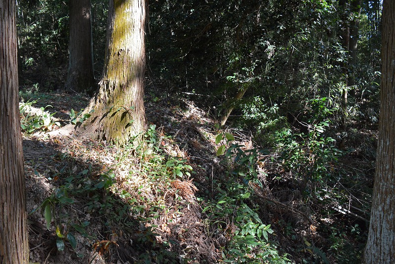林の中をいくらも進まぬうちに目に飛び込んできたのは間違いのない土塁状地形が尾根筋を遮断するかのように南北方向にのびている。