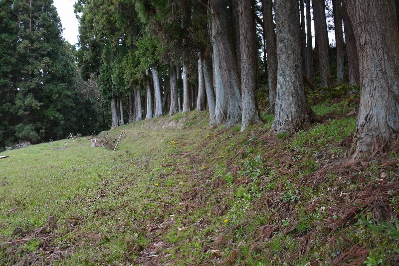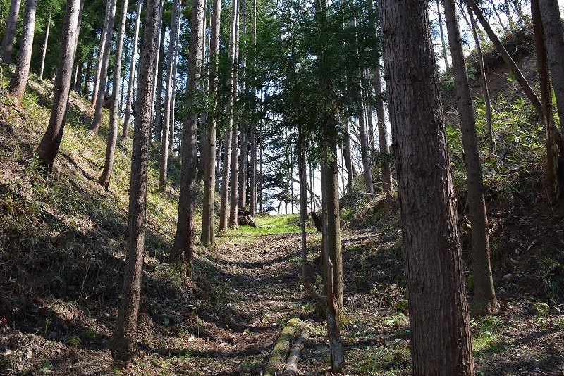 主郭と思われる個所は以前は耕作地であったらしく土塁などの形跡は確認できませんが、稜線南側には明確な切岸と帯郭の存在を見ることができます。