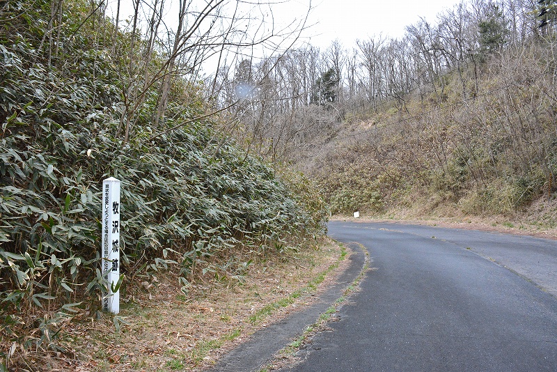 車の駐車スペースを求めつつ工業団地側からこの新しい舗装道路を道なりにすすみ下ると南側(左側)の道路端に城跡の標柱を見出すことができます。