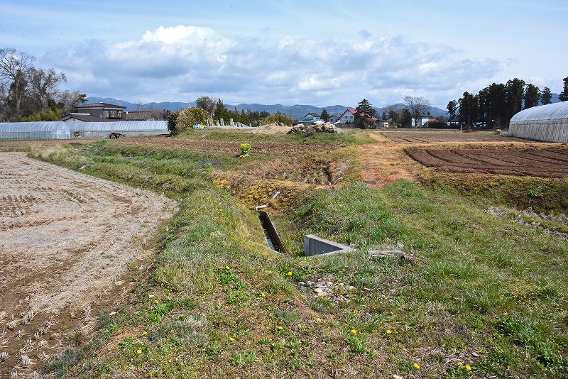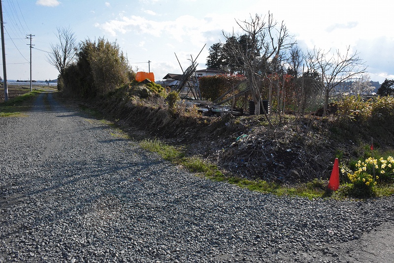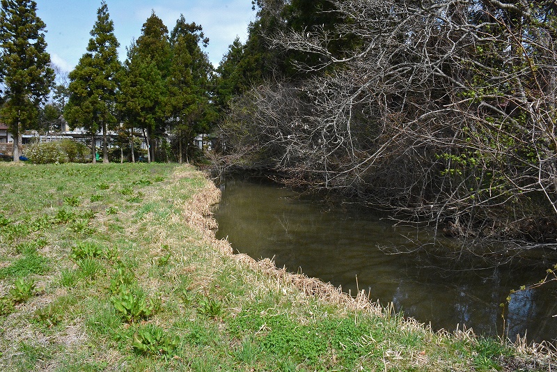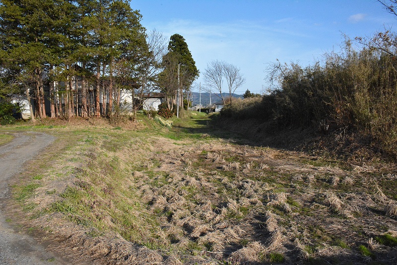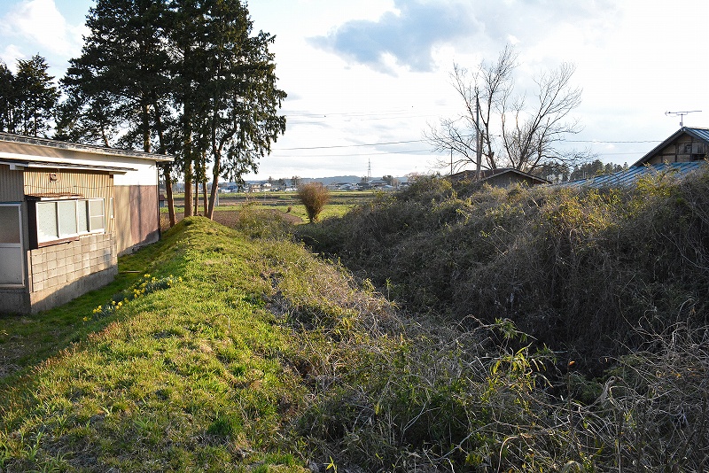 画像の水堀は推定されている城館跡の東側に所在していたものと考えられているようですので、樹木などが見える方の宅地側ではなく、画像左側の広々とした耕作地であるということになります。