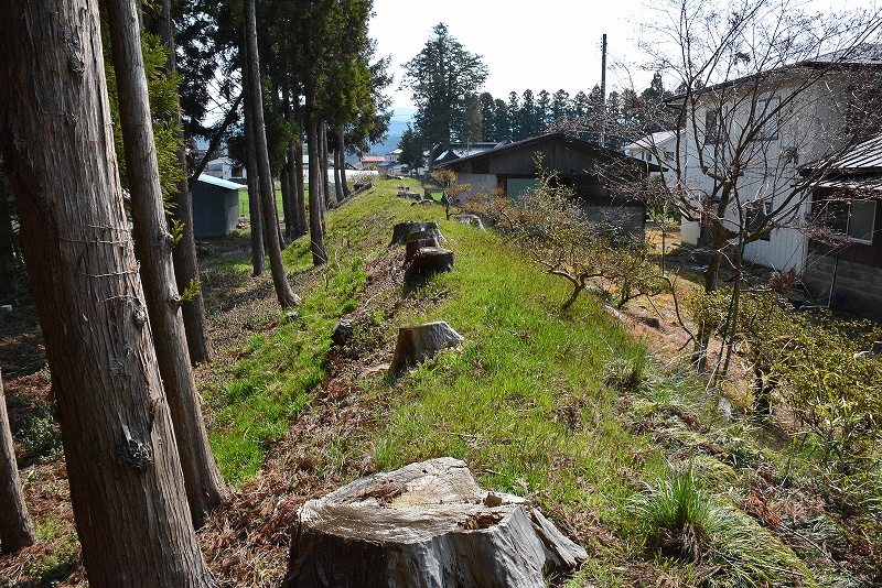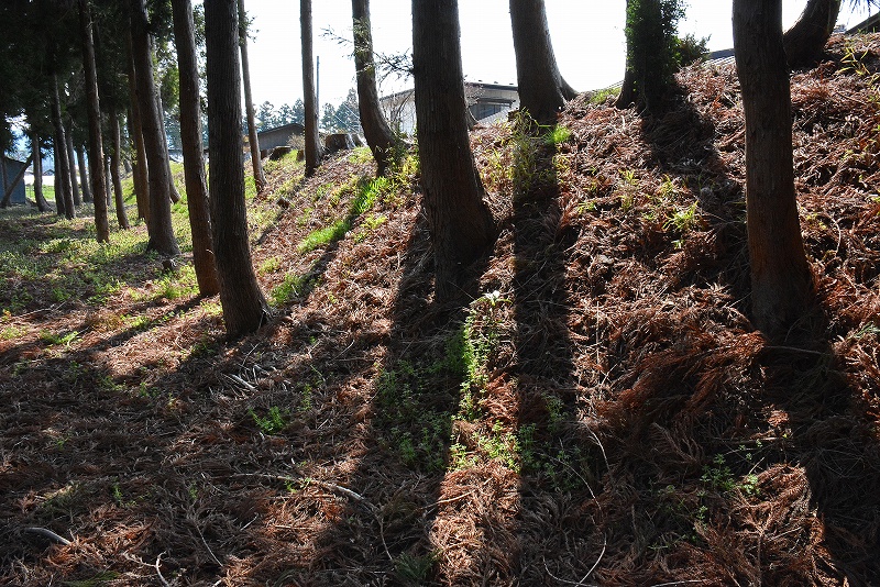 南側の土塁はほぼ消失しているように見受けられますが、これに付随する約5メートルほどの幅を有していたとされる堀跡は現在の集落内の通路となっている様子も窺われます。