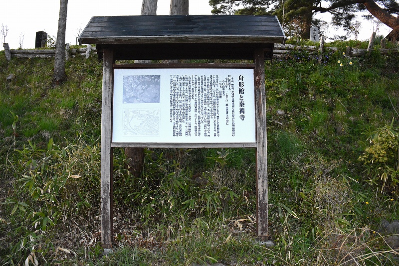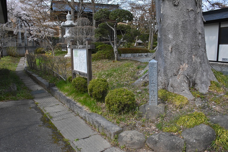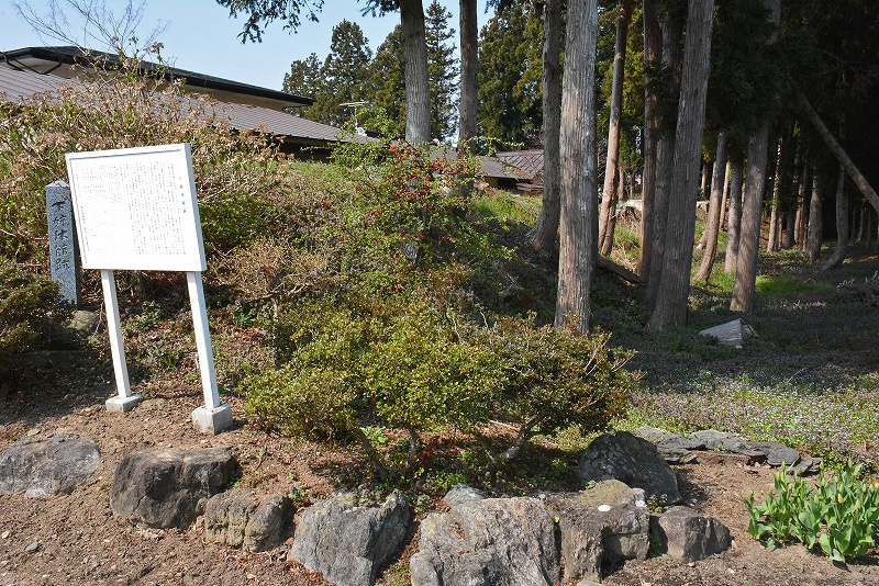 この案内板を含めてざっと周囲を見渡した限りでは、現地には城館跡に関する標柱や解説版の類は見当たらず、南西角付近に3基の太陽光パネルとともに戊辰戦争当時の新旧の鎮魂碑が設置されているだけでした。