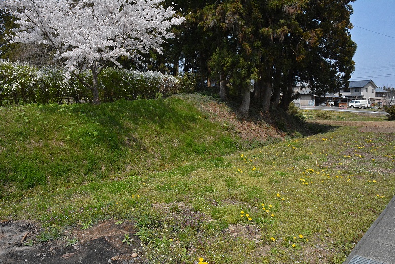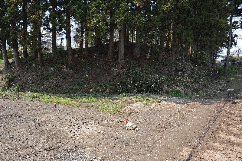 しかし上記の画像からも分かるように、よくよく現地を踏査してみれば、実際には近年において新たに建設された南北に走る市道西側に現在でも所在しており、郭北側の堀跡も明確に遺されておりました。