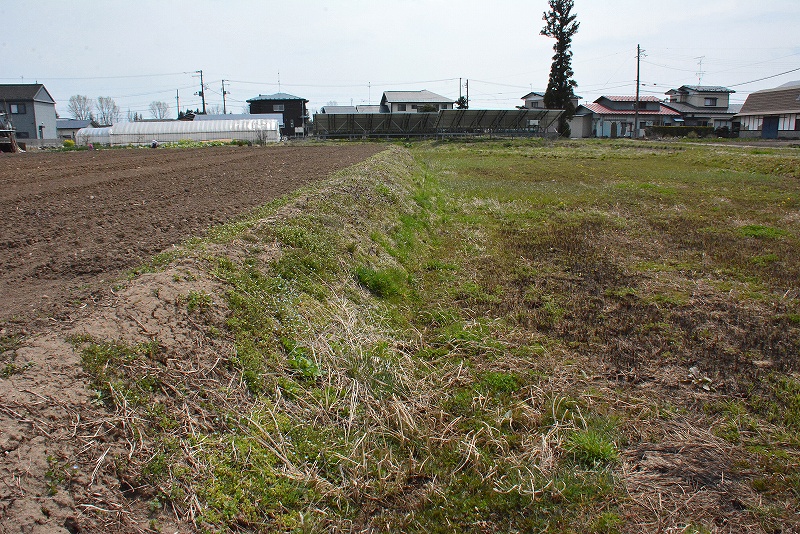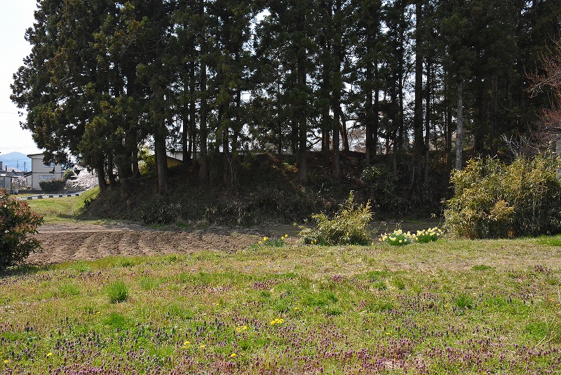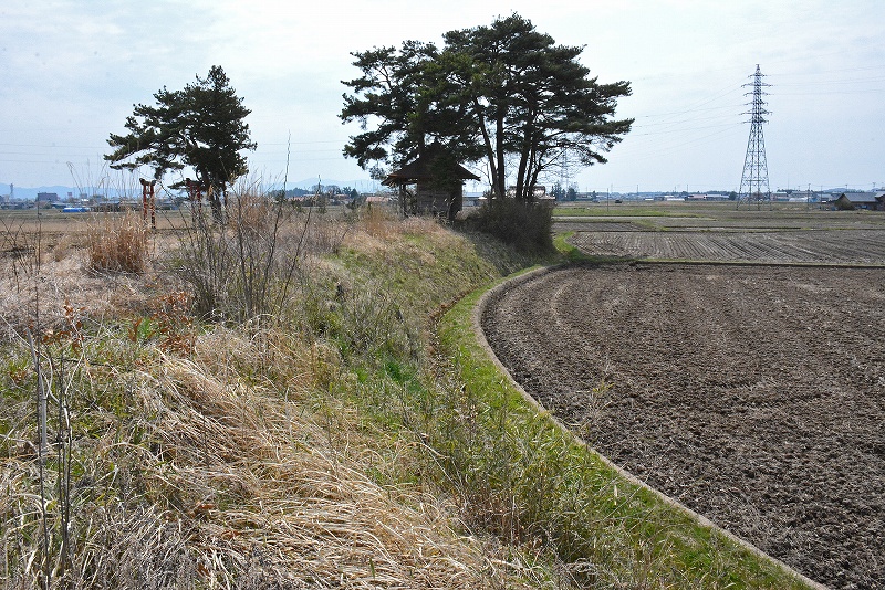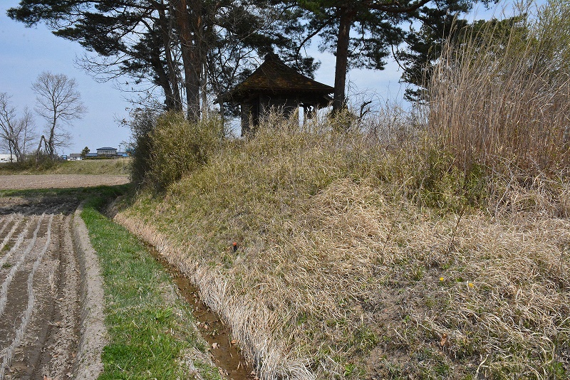 こちらは予め城館跡というような知識が無ければほぼ見落としてしまうような目立ちにくい耕作地内の微高地ですが、よくよくじっくりと踏査してみれば周辺の水田面との比高差は1メートル前後を測ることを確認できます。