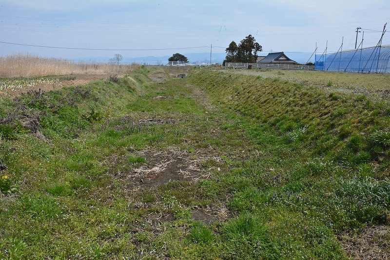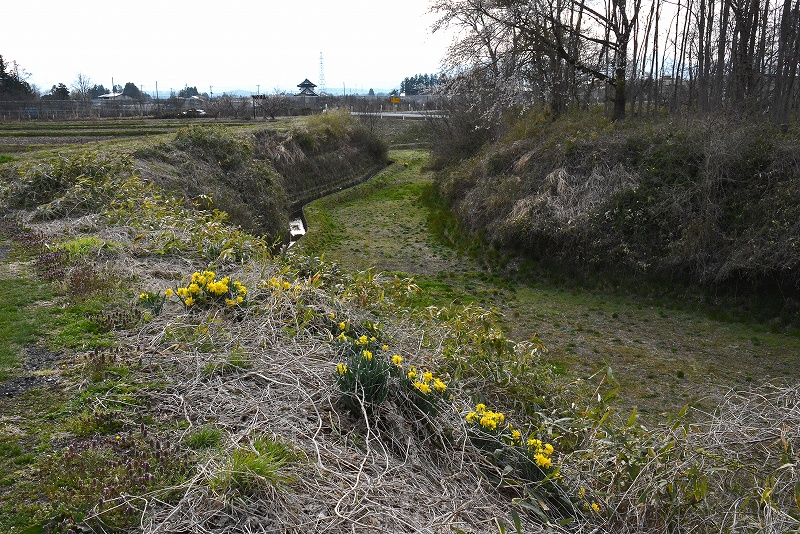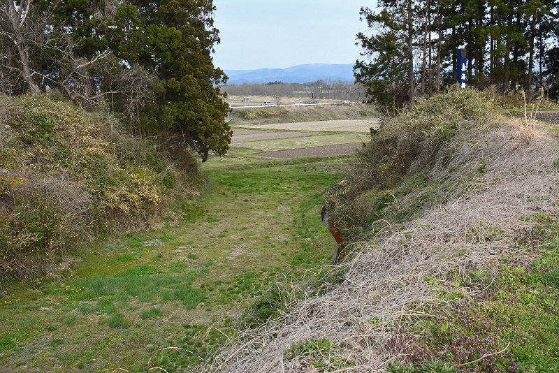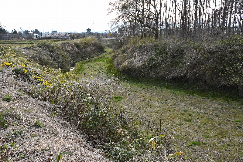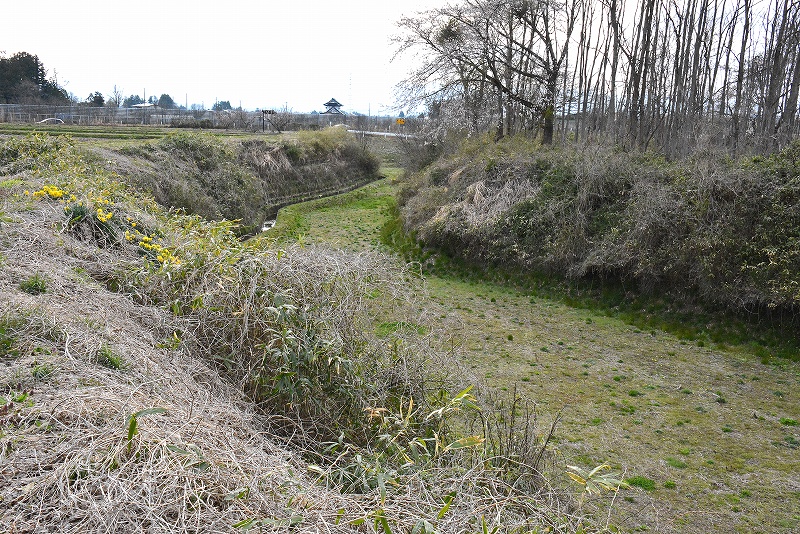 市道の西側道路沿いに立ちますと、今もなおつての堀跡である湿地を確実に俯瞰することができます。