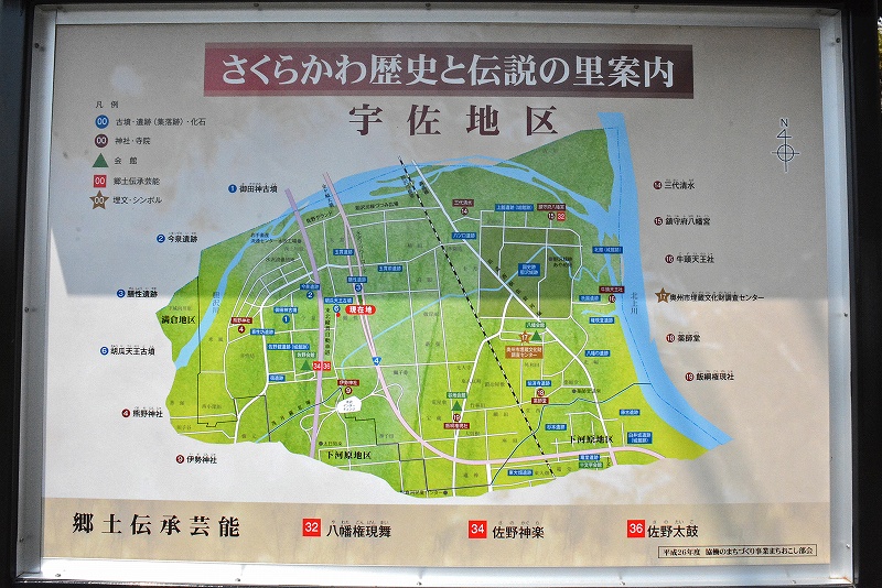 この場所からは少し離れた沿道に設置されていた宇佐地区内の案内板にも「佐野館遺跡(城館跡)」との所在が表記されていました。