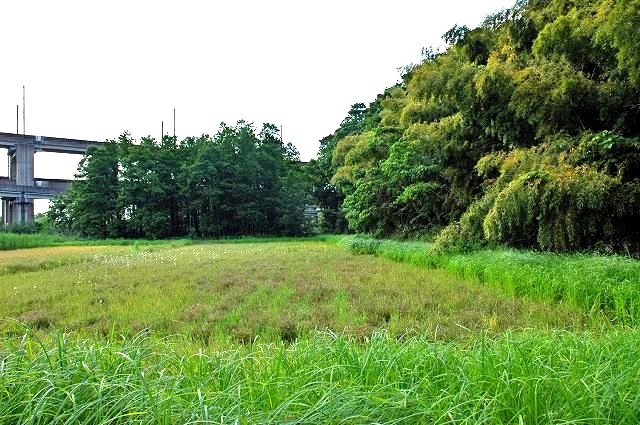 こちらも同様に中世のものと思われる堀跡が検出された遺構。山林部分が比高差1.5mから2mほどの台地を形成しており、伊奈町の第1号の保存樹林に指定されていました。竹林の中に何か目ぼしいものが見つかるかと思い孟宗竹の生い茂った中を蜘蛛の巣を払い、薮蚊を退治しながら見学したものの当然成果はゼロ。北側の細い水路沿いの低地から見上げると、実にいい地形をしているのですが。