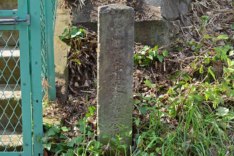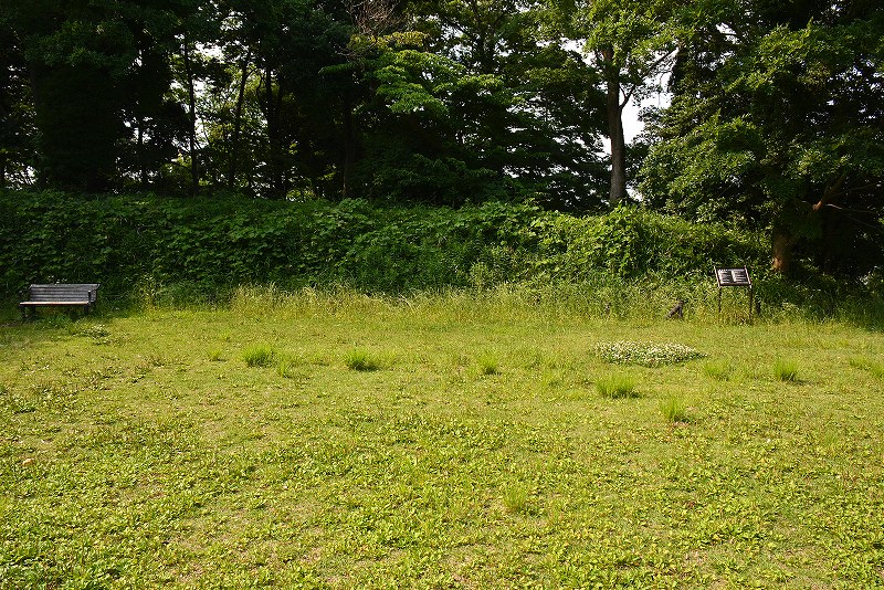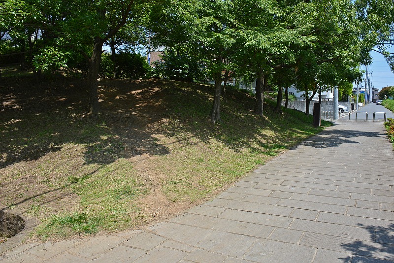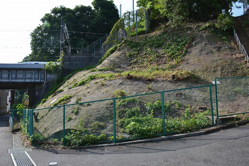 事前の情報通りとはいうものの、残念ながら周囲はフェンスとコンクリート擁壁で囲われ、石碑をふくむ郭、堀切などを直接見ることは叶わず、麓から比高12メートルほどの小さな丘を見上げて探訪終了。