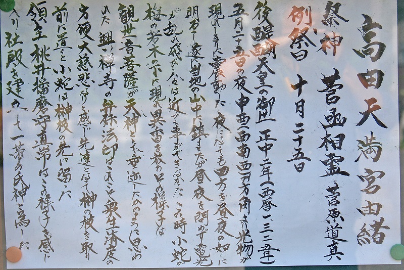 天満宮の手書きの由緒書きには、南北朝初期に領主であった桃井播磨守直常が当社を建立した旨が記されていた。