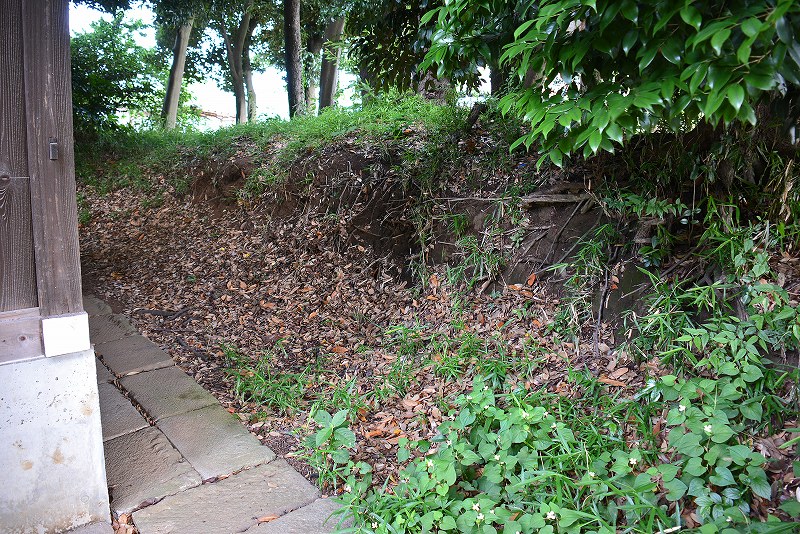 念のため付近の様子を拝見してみたところ、同寺北東の民家に僅かに土塁状の地形の一部が残存。