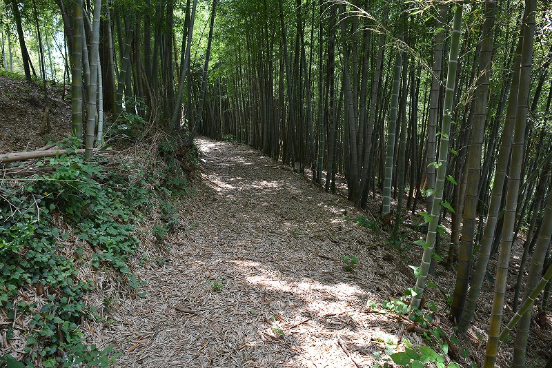 中原街道旧道に入り最初の十字路を右折し、北側の住宅内の細い坂道を息を切らしながら道なりに北上していくと、200mほどすすんだ辺りに東側へと入る竹林の山道がある。