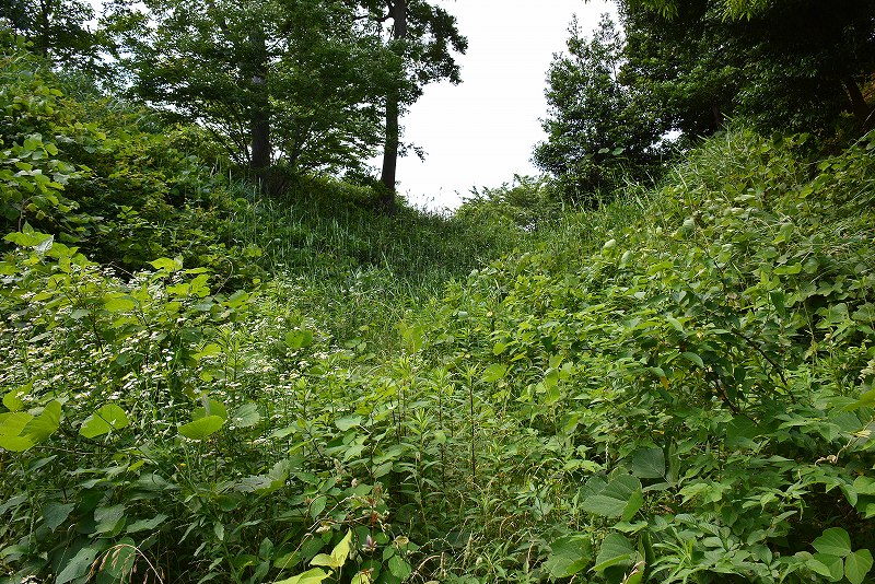 ところが事前に想像していたよりも夏草が元気に繁殖し郭一面を覆い尽くし、復元された主郭の小屋址の石も草に覆われ足でかき分け捜索するような始末。
