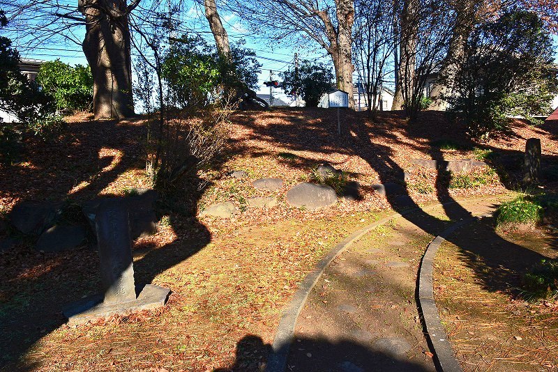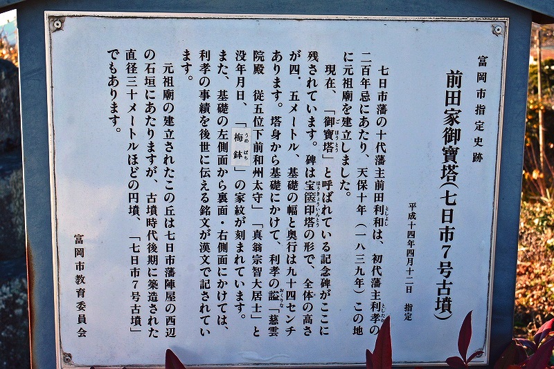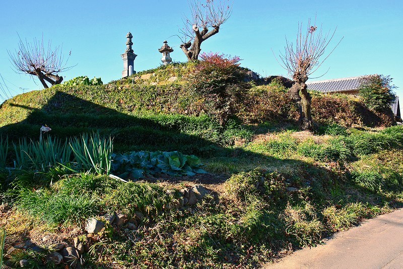 当時の陣屋門、御殿の表玄関と書院を確認し、陣屋北東部にあたる庭園の築山なのか陣屋の土塁跡なのか分かりにくい盛り土の地形を拝見した後は、南西隅の古墳兼前田家宝篋印塔を見学しに行きました。