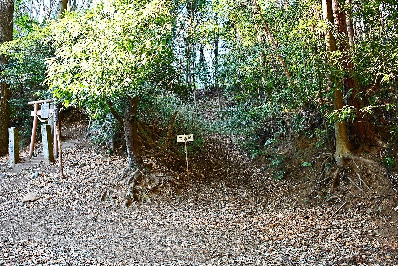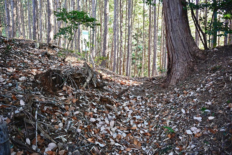 そこそこ有名な二重堀切の遺構は主郭のある山頂から南西方向へと派生した尾根筋の山麓近くに所在しているのですが、山頂の最上段の帯郭経由での下山ルートはほぼ消失しています。