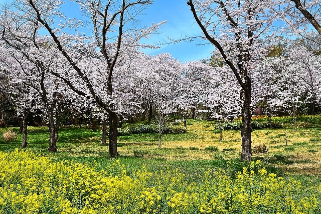 画像は山田城北東の花木園のソメイヨシノとセイヨウアブラナです。