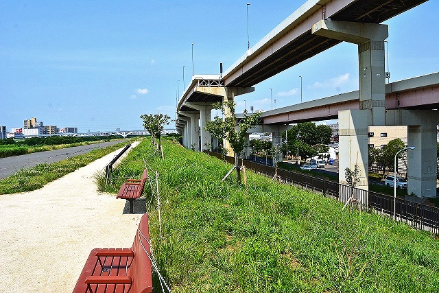 「平和橋通」からわざわざ往復600mほどを回り道して、15m前後の堰堤の階段を上り改めて巨大な堰堤と中央環状線の構造物を眺めてみたが日差しが強く気が遠くなってきた。
